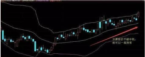 当价格运行在BOLL中轨和上轨之间的区域时(中轨和上轨同时向上),只要价格不跌破中轨,说明市场处于多头行情中,此时我们考虑的交易策略就是逢低点买进,不考虑做空