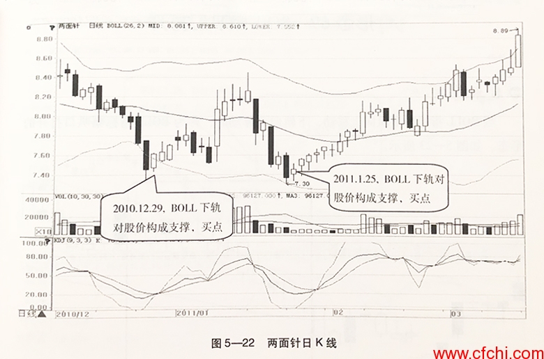 下轨后马上获得支撑反弹。这是一个很好的买入时机。2011年1月25日,两面针股价再次下跌到BOL下轨位置。这次股价并没有跌破BOLL下轨就掉头向上。这也是一个很好的买入时机。