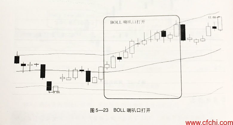 当BOLL指标的上轨向上移动,下轨向下移动时,称为BOLL指标喇叭口打开的形态,如图5-23所示。