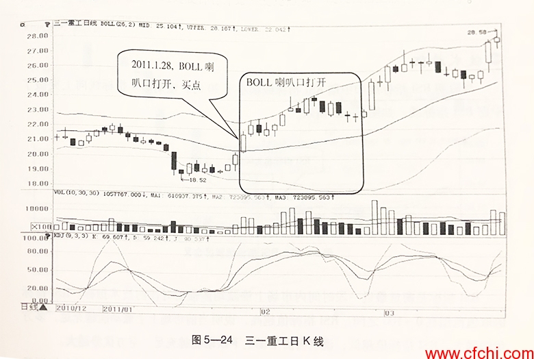 如图5-24所示,2011年1月28日,三一重工(600031)BOLL指标的上轨向上移动,下轨向下移动,二者形成了喇叭口打开的形态,这个形态说明股价的波动幅度越来越大。