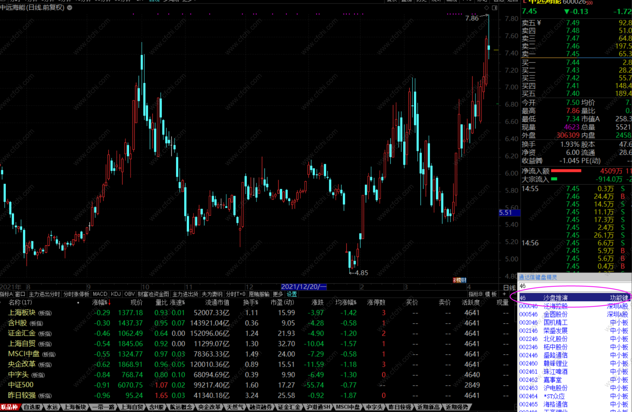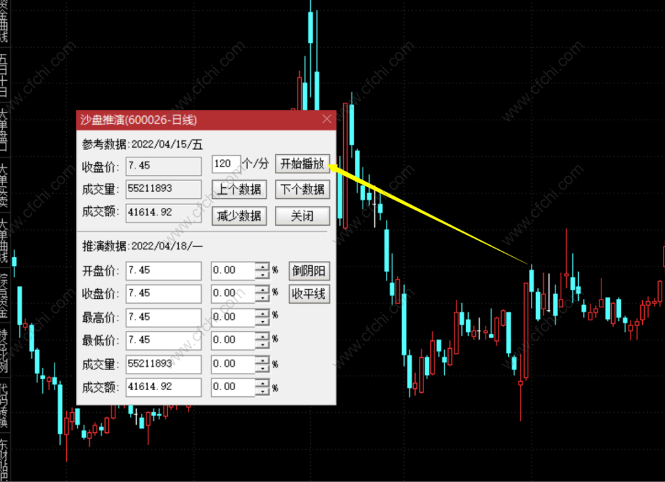 (1)在K线图页面,输入数字“46”,点击即可调起“沙盘推演”工具,如下图所示