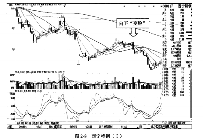 例如,西宁特钢(600117)(见图2-8):该股当时就出现了这种向下“变脸”的走势现象,即股价于2012年3月14日拉出了一根下跌的大阴线,从而引发了一轮继续下跌的行情。
