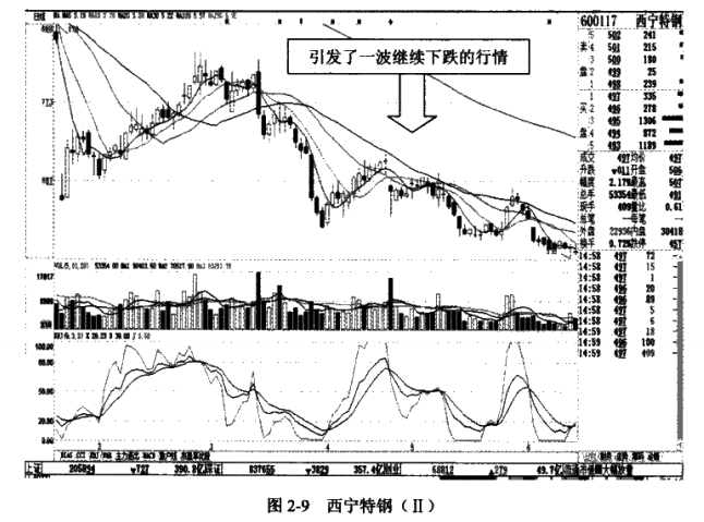 从图2-9中可以看到,当时股价向下“变脸”后便一路下跌,这给当时入场买进的投资者带来了“空前的灾难”。不仅让这些投资者在资金上大幅度缩水,更严重的是重创了自己对操作的信心。