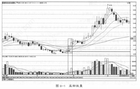 (2)从成交量来看,当成交量极度萎缩之后,于某一日出现了明显的增量情况,往往预示着反弹行情的到来。如图8-1所示。