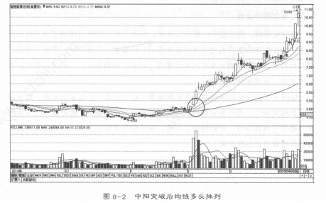 (3)如果突然有一天成交量大增,收出中阳线,即突破盘局,且股价站在10日线之上;突破之后,均线系统开始转为多头排列。这预示着股价即将脱离底部,开始反弹甚至反转行情。如图8-2所示。