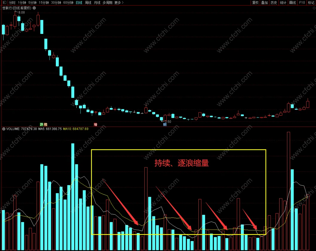 2、虽然世联汇的日线没有图片前高,但是周线量一个比一个高,K线也是高于前面