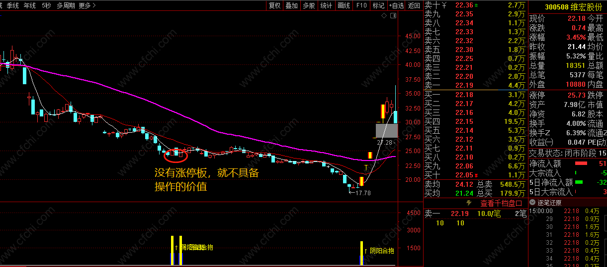 第二种是由个股自身的主力自救行为或者说是由市值管理的私募基金跟上市公司达成某种协议,主力需提前拿到一定的筹码,跌停打开后不久,会有 一个稍微的反弹放量行情,高度有限,拿到的筹码要进行砸盘,使得股价再下一个大台阶,并且边跌 边建仓拿筹码,这个时候通常会创股价新低。比如2018年的智慧农业, 由高处下跌到 低位,期间几乎跌去了80%以上的空间, 这种属于极度超跌了,有的甚至由最高跌幅达90%,通常的表现是有三波以上的下跌走势,在最后的下跌 创新低之前, 个股有2到5天的横盘K线,振幅非常的窄, 直到出现一根大阴线跌穿新低之后(这种叫做空头陷阱,绞杀所有的技术派),股价第二天出现反弹行情并且反包前一日的大阴线实体,这就是超跌反包启动,有些反包涨幅有限,所以我们需做打板操作, 只做那种 极端超跌后的能够涨停的票进行打板。第二天如不如预期则需果断出局,超跌个股很多都是撸一把就走,打板是最有确定性的操作。因为只有涨停板, 个股才具备反弹强度。