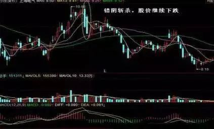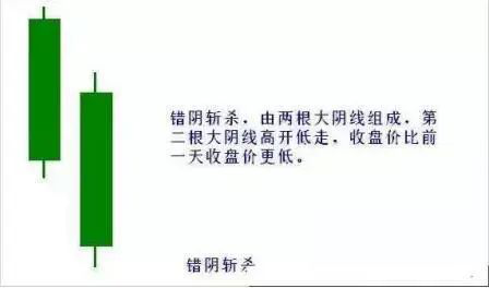 错阴斩杀,顾名思义,错综连接的两根大阴线斩杀投资者,这是股价将继续下跌的标志。很多投资者以为第一根大阴线预示着空方力量衰减,股价将见底.