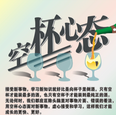 他困惑不解:“杯子已经满了,您为何还要往里倒呢?”高僧回答:“是啊,已经满了,为什么还要继续倒呢?”意思是你已经很有学问了,为什么还来我这里求教呢?这就是人们常说的“空杯心态”。
