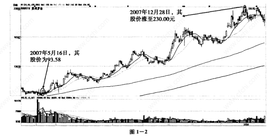 再比如说,高价股贵州茅台(600519),2007年5月16日,其股价为93.58元,这种价格的股票在很多股民眼中已经是名副其实的高价股,但其股价却在高价之上开出了另一个高价,2007年12月28日,其股价飞涨至230.00元。如图1一2所示: