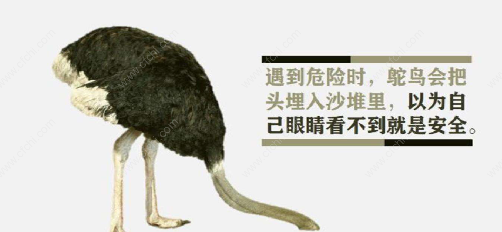 在残酷的现实面前,有些投资者明明能够预料到市场的风险,却依旧视而不见听而不闻,这就是一种“鸵鸟心态”。所谓“鸵鸟心态”,就是指一种逃避现实的心理,也是一种不敢面对问题的懦弱行为。经过研究,心理学家发现,绝大多数现代人在面对巨大压力的时候往往会采取一种回避态度,他们明知问题即将发生却不去想对策,而是尽量地避开它。结果只会使问题逐渐趋向复杂、更难处理。就像鸵鸟被逼得走投无路时,就把头钴进沙子里一样。