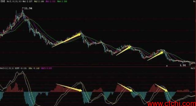 趋势形态:在趋势由多头向空头转折的初期或已经明确进入空头的阶段时,当MACD指标的快慢线在“0轴”线上方死叉后向下运行并击穿了0轴线,或击穿后回升未能有效回到0轴线上,此时表示股价进入了空方市场。当快速线与慢速线出现短期较大的乖离区间时,快速线回靠慢速线后未形成有效金叉而是再次拐头向下,弱势绿柱增长应为继续看空的方向指令。