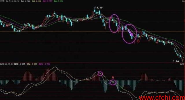 在价格趋势已经处于明确的较大的下降趋势中运行时,当MACD指标的快速线与慢速线在明显的超低值范围出现黄金交叉指令后,指标向上运行并一举突破了“0轴”强弱线进入多头的强势范围。MACD指标的快慢两线已有明显的运行长度,当红柱出现强势背离且呈现缩短的迹象时,说明股价上行已经步入了短期强弩之末,此时应该提高短期风险意识。