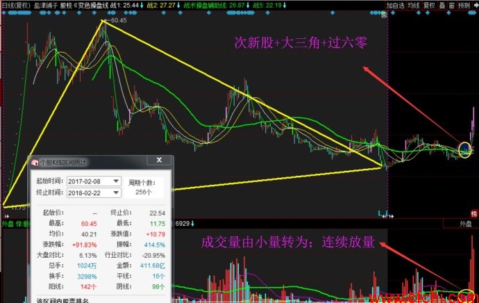 上图是次新股002847盐经铺子,大三角图形区间统计共计256个交易日,该股日线组合成大三角之后,随后股价由60日价格移动平均线的下方转为60日价格移动平均线的上方,当股价在60日均线之上由缩量转为放量的当天,股价盘中封死涨停,与前面的两根涨停板组合成较为经典的涨停遥望K线组合,之后股价连续向上加速飙升。 至于为什么次新股连续回调至首日上市价格附近容易止跌企稳向上拉升涨停。我想原因大概有两个,其一是现阶段新股申购家数明显减少,导致新股稀缺。其二是股价回调至首日上市价格附近,形成大三角图形,股价前期回调充分,超跌明显,股票价格估值优势凸显。