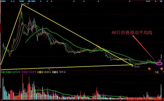 上图中的次新股,从上市首日开始区间统计,共计287个交易日,组合成一个大三角技术图形。 过六零:指的是股价由60日移动平均线的下方向上穿越60日价格移动平均线,并且股价有效站在60日移动平均线上方。如下图: