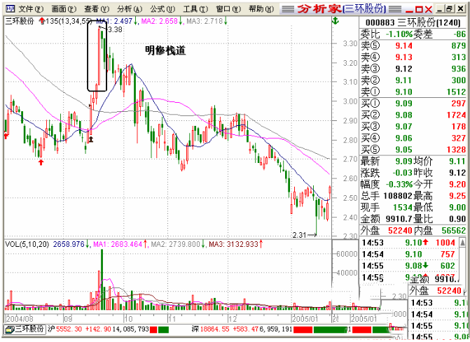 明修栈道这个卖点不好把握,因为庄家往往以做多的面孔出现,量价关系也显得非常健康,致使很多人都放松警惕,即使第二天股价低开低走,仍将它视为正常回调,结果把最好的抛出时机都错过去了,这就是庄家的狡诈之处。如果在明修栈道出现时没有来得及走,第二天应密切关注股价的开盘价,如果低开低走,庄家真出货假拉升的意图就原形毕露了,图表上常常以金蝉脱壳的技术形态列示。