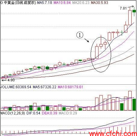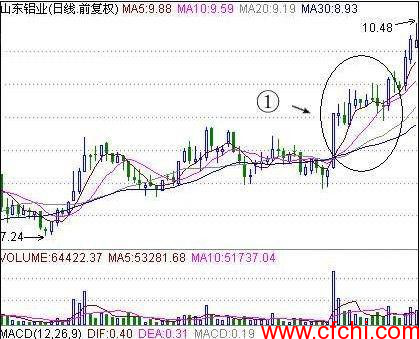 挑选那些低位经过一段时间震荡横盘吸货之后,开始启动的个股,初期呈现均线多头排列的时候,可及时跟进。前提是对个股的基本面分析要有一定的水平,多挑选业绩优良的个股,图①处,该股涨停板放量启动进攻,均线开始多头排列,可以在股价贴近5日或10日均线处买入。