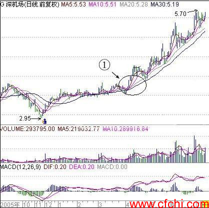 来看一个例子:该股前期均线并没有形成多头排列,但在图中①处均线开始形成多头排列,而深圳机场是基础建设类股,这是只慢牛股,此时是中线买进信号!