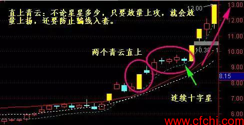 随着股价上升,在中大阳线后会出现或多或少的类十字星。这些类十字星只是上涨途中的暂时整理而已,次日若股价上扬且伴随着成交量的有效放大,一般为介入信号,通常将在出现一波快速上攻行情。本k线组合中类十字星数量多少不定,少则一颗,多则三.四颗;无论星线多少,只要再次放量上攻,即会加速上扬,股投资者一般应在放量是及时介入,坐享顺水推舟之乐。具体操作中,要同时认真观察个股基本面和消息面,提防某些主力和机构借此形态骗线出货。