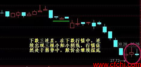 下跌行情中,中阴线出现三根小阴小阳线,价格将再往下探底。