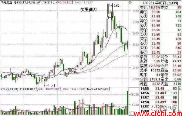 (2)庄家会利用技巧把股价推高一至两天,但缺少量能支持的虚浪拉升,终究无法掩盖股价即将调整的意图,因为笑里藏刀的庄家已经露出了杀机。