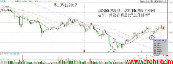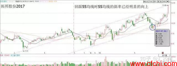 如图:两个例子都是2017.7.18回踩55均线,为什么后期的涨幅不一样呢?主要是55均线的“斜率”。1、刚刚走平的未来涨幅较小。2、已经向上倾斜的未来涨幅较大。