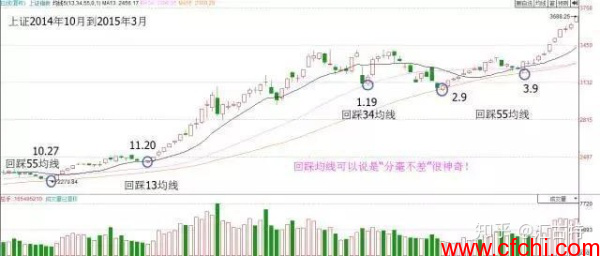 其中最主要的是:回踩均线时34、55均线的“斜率”。如果在34或者55均线附近出现标志K线并且配合标志量站上中线组为佳.