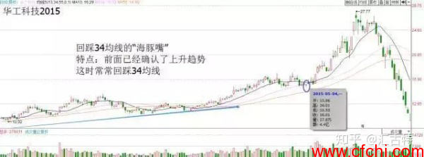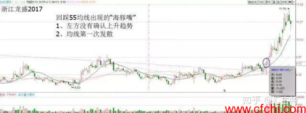 具体到34均线出现海豚嘴还是到55均线出现海豚嘴,这是有前期的趋势决定的,如果前期是一波下跌趋势,则可能回调55均线左右,因为回调55均线是二浪的回调。