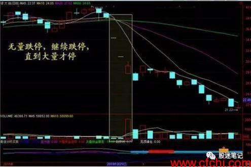 1、无量跌停,继续跌停,直到大量才停:股票出现跌停板,同时成交量很小很小,称之为无量跌停,随后股价有可能继续出现跌停,一直到有大量出现的时候,才有可能结束跌停,出现反弹行情或者是反转。