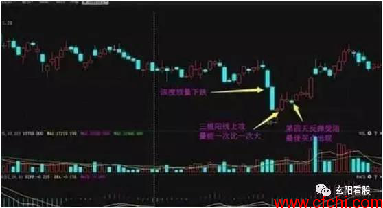 首先,我们来看远望谷的实战图形。在上面的走势图中,笔者指出了四点,我们看到股价首处于下跌走势中,三根跳空的阴线,导致了股价的深度放量下跌,然后三次阳线上攻,而且量能一次比一次大,在第四天的时候出现了反弹受阻的现象,显然最佳的买点已经出现了,后面的强力反弹开始。