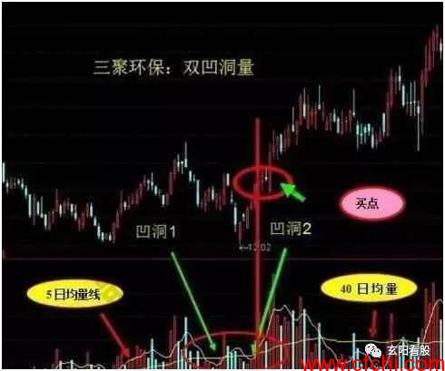 在三聚环保的走势图中,就形成了双凹洞量。具体就是:在底部构造过程中,5日均量线上穿40日均量线,成为凹洞量也叫成交量圆底。股价恢复上涨后,再次缩量回落,当再次出现凹洞量时,就是双凹洞量为底部结束标志。凹洞的水池越深,上涨力量越大。接下来我们在说一下量价选股法的两个技巧。