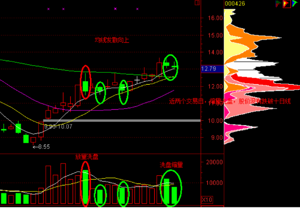 强庄洗盘不跌破10线,这种走势说明庄家控盘度非常高,弱庄洗盘会跌破20日或者60日线,但是每次跌破都是咱们买进的机会。