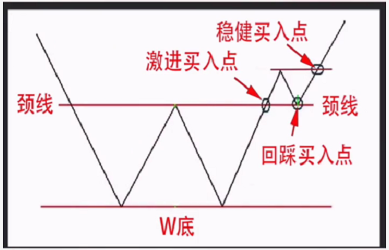 不管是V型底,W底头肩底,圆弧底,主力准备拉升股价时,会有一个颈线突破动作,这里共有三个买入机会: