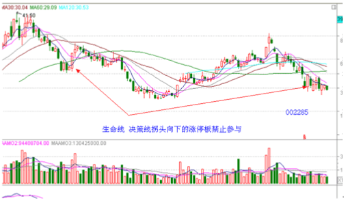 002285,世联地产,2009年12月24日,2010年5月5日,这两天都出现了涨停板,但都明显的处于下降趋势中,均线都成空头排列,生命线和决策线对股价压制明显,这种情况属于弱势涨停,只有分时盘口极好的绝顶高手才可参与,普通散户只有观望的份。