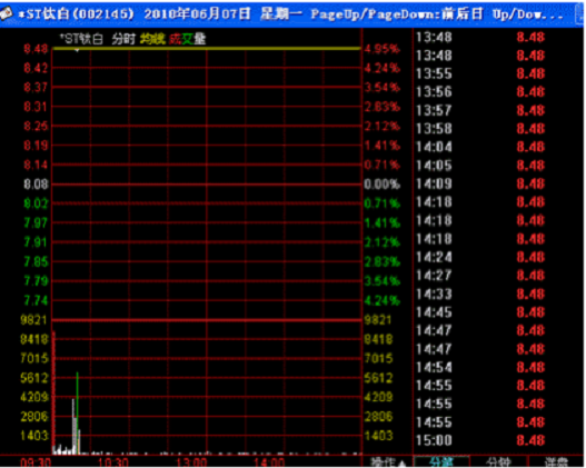 这是ST钛白(002145)在6月7日集合竞价一字板巨量封涨停,9点25分发现此种情况立马排队挂单,很走运,当日大盘剧烈震荡,此股盘中开办,幸运成交,准备第二日冲高卖出。