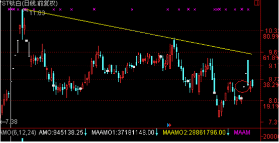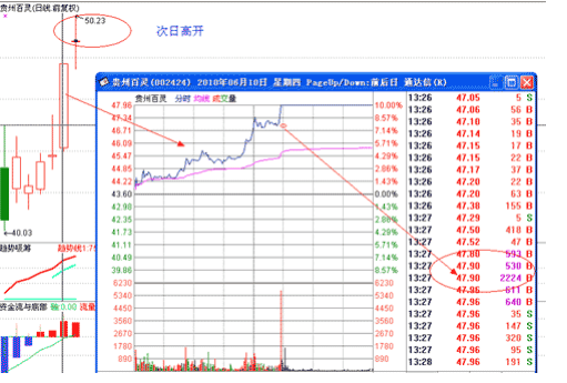但高兴的还在后头。第二日此股开盘便巨量封死涨停,此种情形便可继续持有,但股价毕竞处于明显的下降趋势中,第三日开盘无法封涨停便卖出为宜,从图中可以看出第三日该股高开诱多后便转头大跌。
