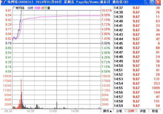 广电网络在2010年1月8日早盘半小时四波封死涨停,股价突破箱体,主力做多决心异常坚决,临盘可在最后一笔封死涨停前跟进,或在涨停后排队买入。