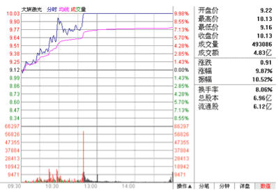 下面给出的是大族激光(002008)在2009年12月25日的实战案例,很简单,从分时看封板后出货量极小,从趋势看股价芙蓉出水,临盘参与价值较大大,实战时可在最后一笔大单封涨停时买入,或在涨停后后挂单买入。