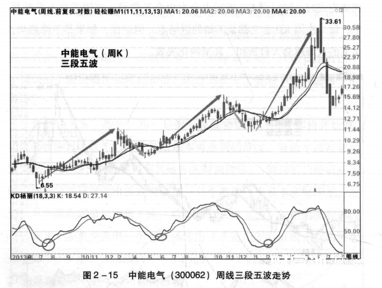 如图2-15所示,中能电气(300062)在2013年6月底7月初,K线走势形成双底,右脚不破新低后,呈上升趋势,开启一波牛市。在此过程中,形成三段上攻,中间夹两波回调,周线呈三段五波走势,至第五波加速高仰角上攻后见顶。从底部价6.55元计算,乘以5,得到32.75元。该股最高冲到33.61元顶部价。