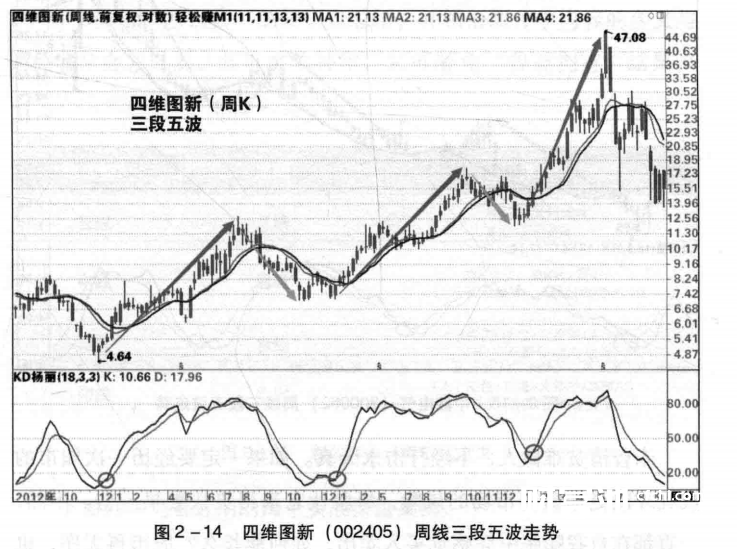 如图2-14所示,从2012年12月见底后到2015年5月的这一波牛市,四维图新(002405)从周线上看,共走出三次攻击波,加上两次回调波,呈三段五波的走势。三段攻击波完成后,迎来头部,短短10周股价就下跌了70%。