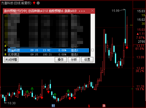 今天实战的信号点开仓股票300235方直科技可开盘价抢进,按计划交易后的操作就是设置好止损12.4,目标止盈在20.2附近,坚持趋势持仓到目标价或下月冲高卖股,配上今天的早盘选股条件实时图