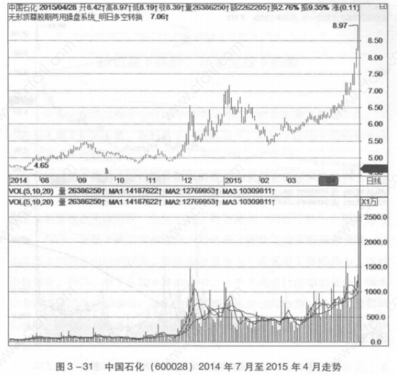 在图3-31中,中国石化是一只大盘蓝筹股,自2014 年7月开始发动的上涨行情中,中国石化也形成了整体上升的形态,自低点到2015年4月份的高点股价上涨了4.32元,涨幅为92. 9%。你可不要认为9个月的时间居然涨了这么多,同一时期指数都已翻倍,而它却还没有翻倍,涨幅是落后于指数的。