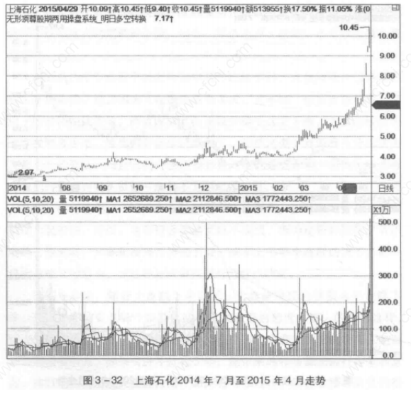 相比其他个股,上海石化肯定是大盘股,但对于中国石化来说,它只能排位于二线蓝筹。在图3-32中,自2014年7月上海石化的股价从2.97元上涨到最高的10.45元,上涨7.48 元,涨幅为252%,其涨幅远远超过中国石化。为什么同属于石化板块,但是涨幅却相差这么大呢?