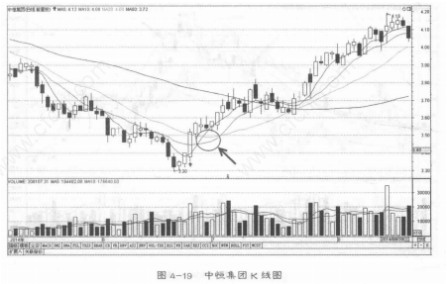 如图4-18所示的特力A K线图,在经过一波下跌行情后开始大幅反弹,在向上运行的过程中,10日均线成功上穿20日均线,预示着中期将有一波上涨的行情。