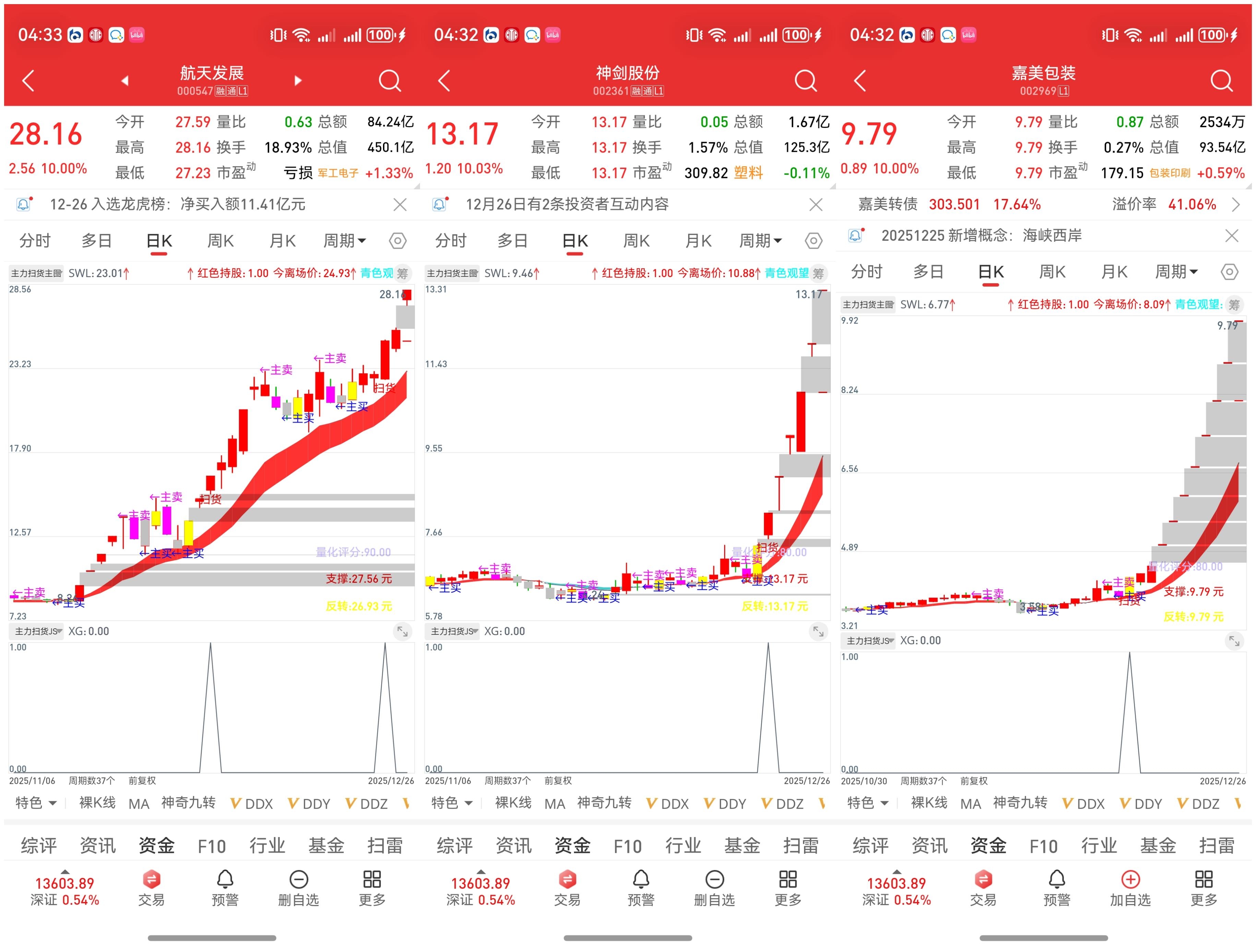 数据不会说谎!近期商业航天、高端制造等热点赛道爆发,12月26日神剑股份单日涨停,佳美包装、航天发展同步封板,这些牛股绝非偶然 —— 背后都是主力大单吸筹的痕迹,而这正是我们策略的核心信号!