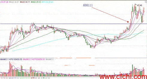 600111,包钢稀土,2010年4月20日,在越过前期重要阻挡线时出现了涨停盘口,通过对2009年的走势研究发现,该股2009年间出现了12个涨停,平均每月一个涨停板,当时考虑到该股主力应该非常凶悍,所以大盘环境不佳却仍有涨停可能,可以轻仓一搏,结果效果不错,在实战中涨停基因好的股票成功的概率更高。