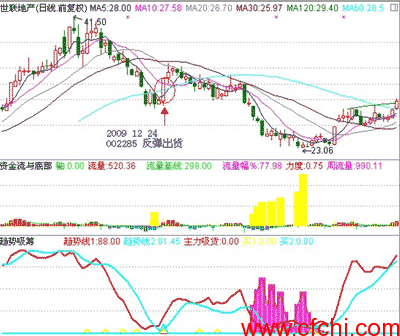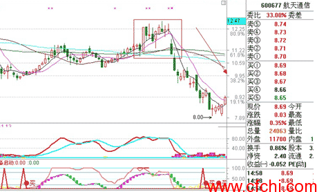 上面实战范例一的涨停是有效的,是趋势起涨的标志性K线,但并不是所有的涨停都能有如此效用,要是千篇一律那就不是股市了,有的涨停也不过是仅仅延缓了下跌趋势,并未能奠定后市的上涨趋势;有的就是下跌中的反弹出货,如下面实战范例二中的世联地产;有的却是倒霉孩子,主力并非不想做行情,无奈碰上了大盘暴跌只好作罢,谁都不敢和趋势作对,像下面实战范例三中的航天通信便是如此。