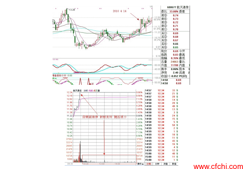 600677航天通信,这个股票2010年4月14日涨停,如果仅看上图你会发现形态很美,和实战范例一中的凯恩股份真的很像,一根涨停K线让该股所有均线修复完毕,大行情感觉是一触即发。从分时看早盘半小时内封死涨停,属于白银级涨停,封板良好,抛压很小,这样的判断应该很谨慎,买入应该没什么技术上的瑕疵,尾盘最后一笔大单前跟进了一些,随后几日调整时又买入了一些,一心想坐等大波段收益,无奈天有不测风云,随后几日大盘开启了近500点的暴跌之旅,该股也是没能挺住,按照战术纪律,损失超过建仓成本的的8%短线就要出局,无奈之下只好作罢 。究其原因也并非不是主力不想发动发情,实乃系统风险所致,在这系统环境篇中讲解的很清楚,还是自己过于自信,以后朋友们还是吸取我的教训,大跌世道慎用涨停板战法。