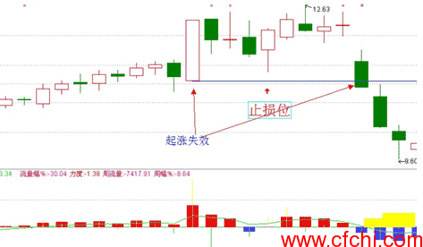 并非所有的涨停板都能奠定上涨趋势,涨停后的调整一旦吞掉该涨停K线必须无条件止损。如下图所示: