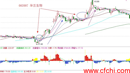 002007,华兰生物,2009年8月至今的走势图,从上图上大家可以清楚地看到,两个芙蓉出水的涨停板奠定了两个大波段上涨行情,股价也从17元涨至43元,完全符合以上四个条件。很多医药股走势都是如此,长时间盘整然后标志性大阳线启动一波行情,然后再盘整再大阳线启动,如此往复。生物医药板块这个国家重点扶持的行业慢慢长牛路还没有停止的迹象,临盘时要给予高度关注。